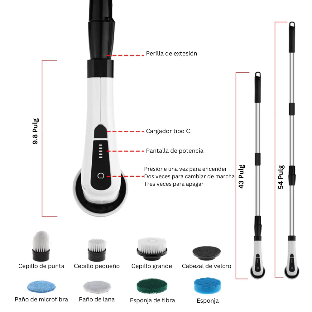 Con su mango extensible de hasta 130 cm y sus nueve cabezales intercambiables, llega sin esfuerzo a cada rincón de tu hogar: azulejos, duchas, pisos, cocinas, paredes y más.
